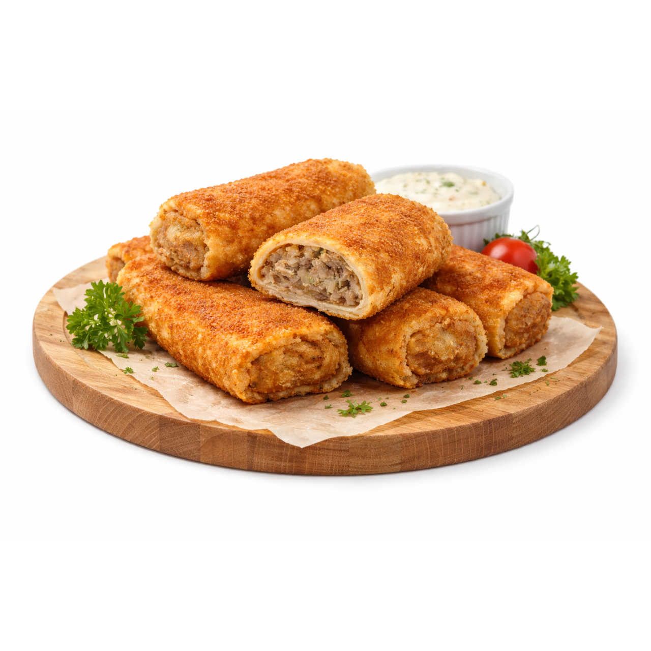 Złociste krokiety z delikatnego naleśnika, wypełnione farszem z mięsa wieprzowego i warzyw, obtoczone w chrupiącej panierce. Doskonałe na obiad lub kolację, szczególnie po krótkim podsmażeniu.